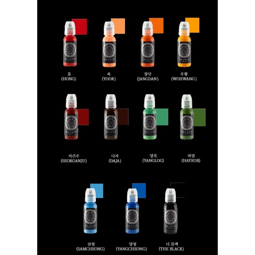 홍(HONG) , 육(YOOK) , 장단(JANGDAN) , 웅황 (WOONG HWANG) , 석간주(SEOKGANJU) , 다자(DAJA) , 양록(YANGLOG) , 하엽(HAYEOB) , 삼청(SAMCHEONG) , 양청(YANGCHEONG) , 더 블랙(THE BLACK)